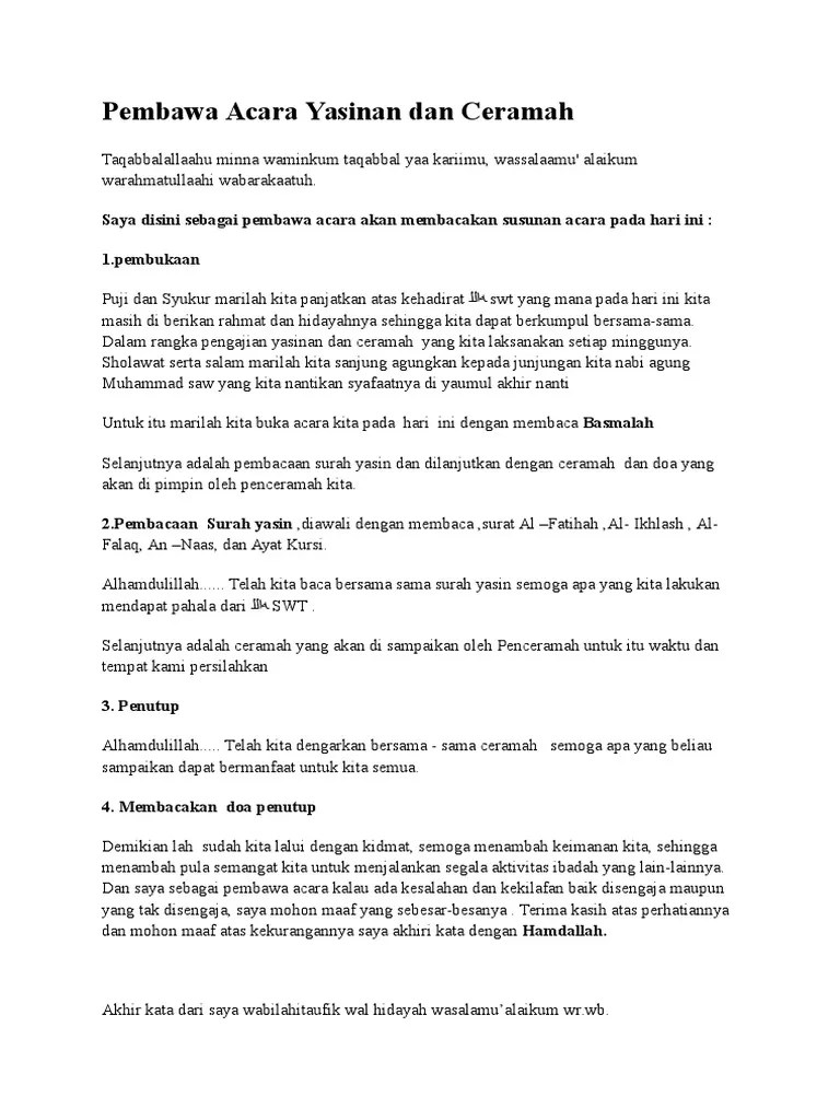 Asyhadu anlaa ilaaha ilallaah wahdahu laa syari kalah, wa asyhadu anna muhammadan … Kematian islam kata kata takziah orang meninggal mc acara pemakaman. Ditinggalkannya senantiasa diberikan kekuatan iman dan islam,. Saya selaku ketua panitia acara haul ini sangat bahagia karena kita semua berkumpul dan dudu bersama dan saling rukun betapa indahnya kebersamaan ini betapa saya merasakan suasana keluarga yang sangat harmonis ini dan saya ingin … Sep 22, 2014 · pidato pembawa acara tahlilan dalam bahasa jawa. Jun 24, 2012 · pidato pembawa acara tahlilan dalam bahasa jawa written by sinar indo brass on sunday, 24 june 2012 | 12:50. Asyhadu anlaa ilaaha ilallaah wahdahu laa syari kalah, wa asyhadu anna muhammadan 'abduhu warosulu la nabiyya ba'dah. Feb 12, 2019 · teriring do'a semoga kesejahteraan, keselamatan dan barokah allah senantiasa tercurah kepada kita semua, aamiin. Islam pengajian biasanya dilakukan sebelum mengadakan suatu acara. Semoga bermanfaat untuk kita semua.aamin. Alhamdulillah, alhamdulllahilladzi anzala sakinata fiiqulubil mu'minin liyazdaadu iimanan ma'aa immanihim. Nov 04, 2016 · tahlilan merupakan ritual pembacaan lafal tahlil yang lazim di masyarakat nusantara sejak ratusan tahun. Alhamdulillah, alhamdulllahilladzi anzala sakinata fiiqulubil mu'minin liyazdaadu iimanan ma'aa immanihim.