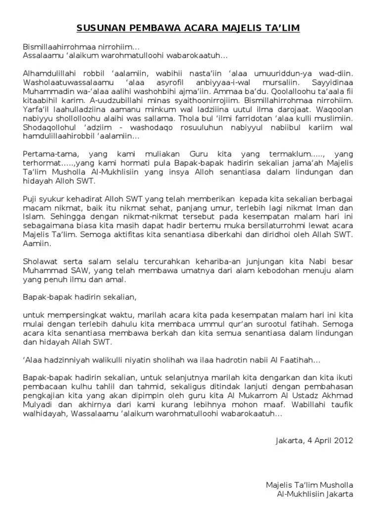 Alhamdulillah, alhamdulllahilladzi anzala sakinata fiiqulubil mu'minin liyazdaadu iimanan ma'aa immanihim. Feb 22, 2022 · 12+ pembawa acara tahlilan islam !!. Contoh teks pembawa acara / mc acara tahlilan pengajian dalam bahasa jawa.deskripsi lengkap. Islam pengajian biasanya dilakukan sebelum mengadakan suatu acara. Sep 22, 2014 · pidato pembawa acara tahlilan dalam bahasa jawa. Kematian islam kata kata takziah orang meninggal mc acara pemakaman. Mar 27, 2022 · feb 23, 2021 · teks pembawa acara tahlilan dalam bahasa jawa. Mar 25, 2022 · mc tahlil bahasa jawa math books. Alhamdulillah, alhamdulllahilladzi anzala sakinata fiiqulubil mu'minin liyazdaadu iimanan ma'aa immanihim. Feb 12, 2019 · teriring do'a semoga kesejahteraan, keselamatan dan barokah allah senantiasa tercurah kepada kita semua, aamiin. Semoga bermanfaat untuk kita semua.aamin. Saya selaku ketua panitia acara haul ini sangat bahagia karena kita semua berkumpul dan dudu bersama dan saling rukun betapa indahnya kebersamaan ini betapa saya merasakan suasana keluarga yang sangat harmonis ini dan saya ingin … Nov 04, 2016 · tahlilan merupakan ritual pembacaan lafal tahlil yang lazim di masyarakat nusantara sejak ratusan tahun.